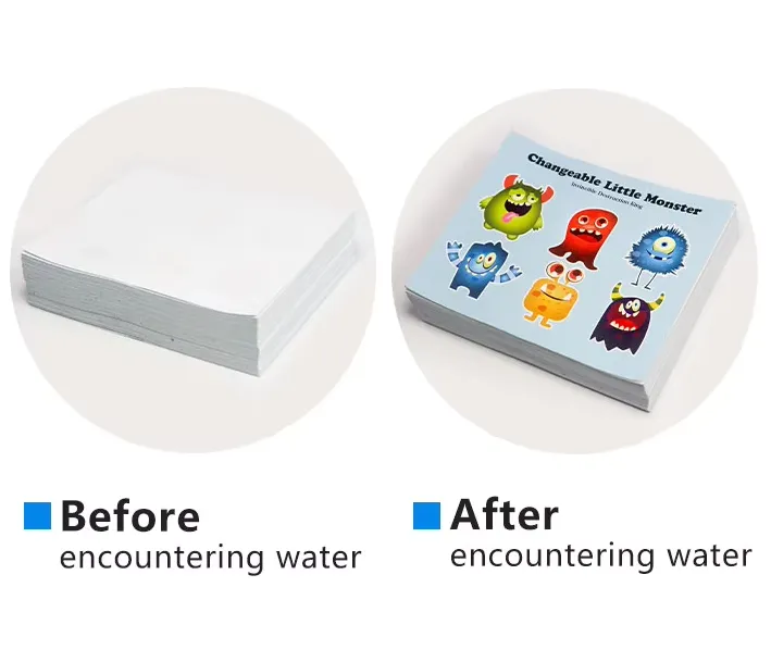 جب پانی میں ڈوبا جاتا ہے تو ، یہ فورا. ہی پیسٹ جیسی حالت میں بدل جاتا ہے اور جلدی سے منتشر ہوجاتا ہے۔ اس پر چھپی ہوئی رنگ پھر پھیلتے اور اس کے مطابق خراب ہوجاتے ہیں۔ رنگ بدلنے کا عمل ناقابل واپسی ہے۔ ایک بار پانی کے سامنے آنے کے بعد ، یہ مستقل طور پر رنگ ظاہر کرے گا۔