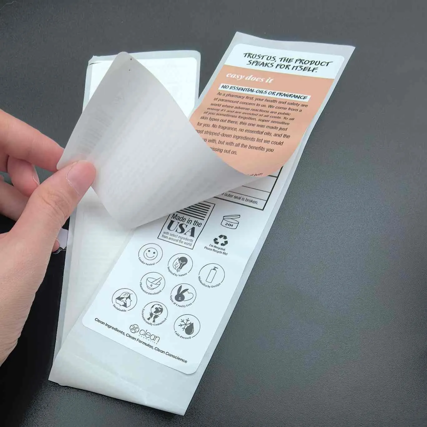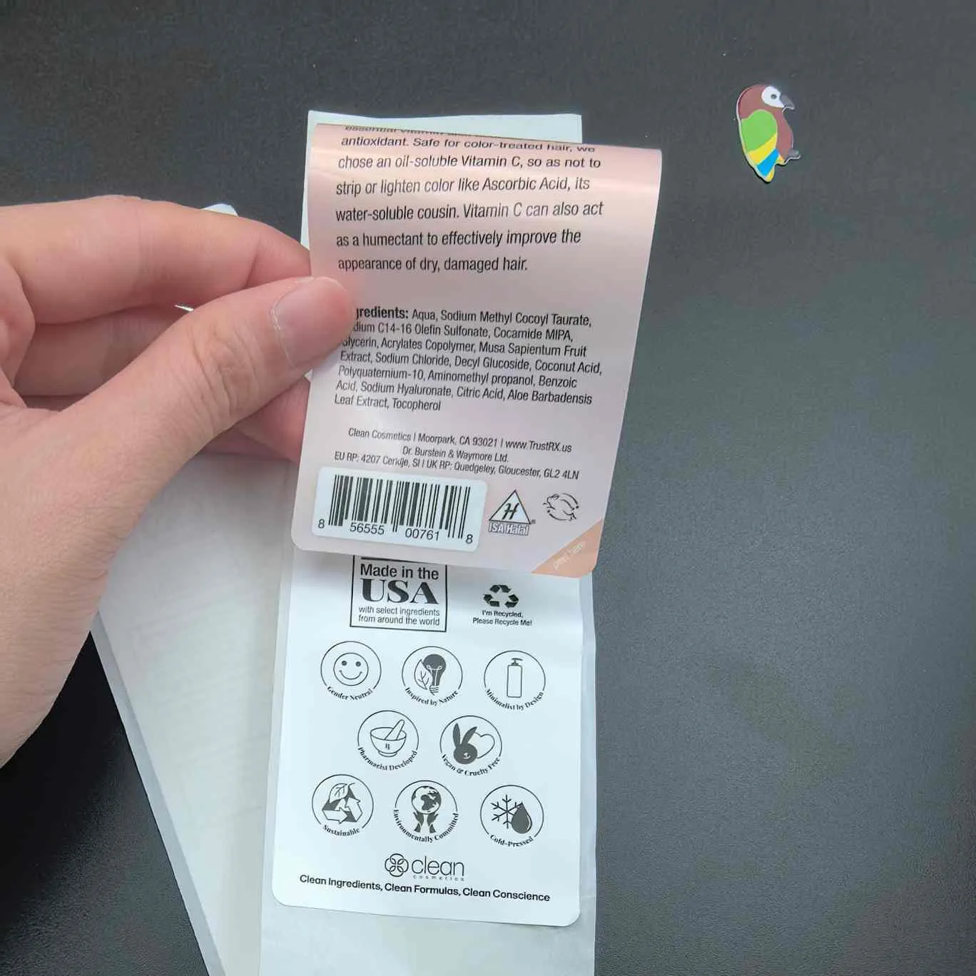 چھلکا اور پڑھیں لیبل:سب سے بنیادی قسم ، اسے کاسمیٹک لیبلوں کے لئے ملٹی لیئر بھی کہا جاتا ہے ، اوپری پرت چھلکا کرنا آسان ہے ، اور اندرونی پرت میں توسیع شدہ معلومات ہوتی ہے۔ یہ اکثر چہرے کے ماسک ، سیرمز اور دیگر چھوٹی چھوٹی مصنوعات کے لئے استعمال ہوتا ہے۔